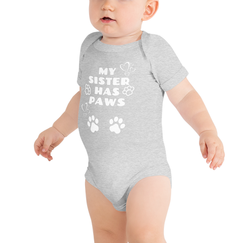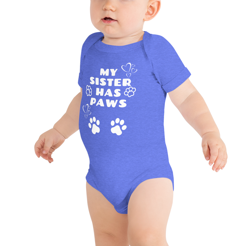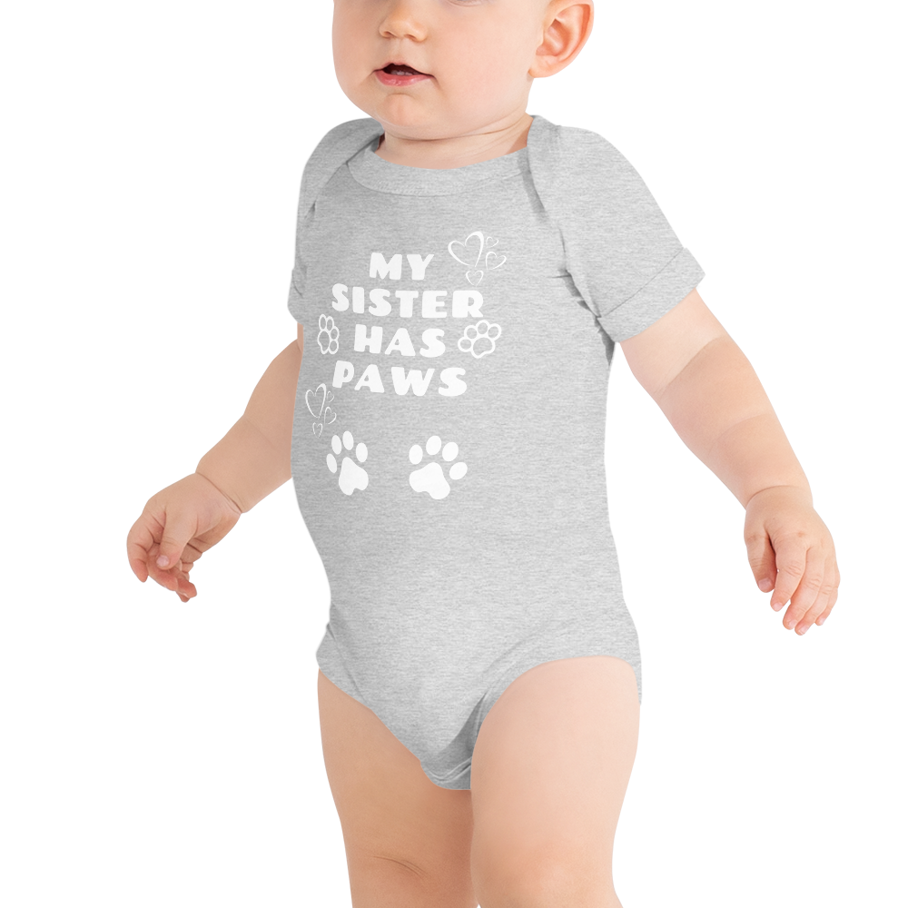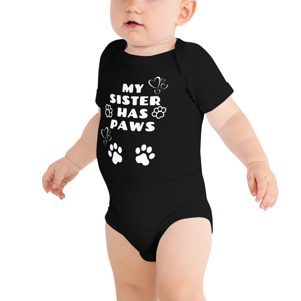 This product is great for any child that has a sibling with "paws." This comfortable bodysuit will be a great addition to any baby’s wardrobe, and lap shoulders will make for easier changing.